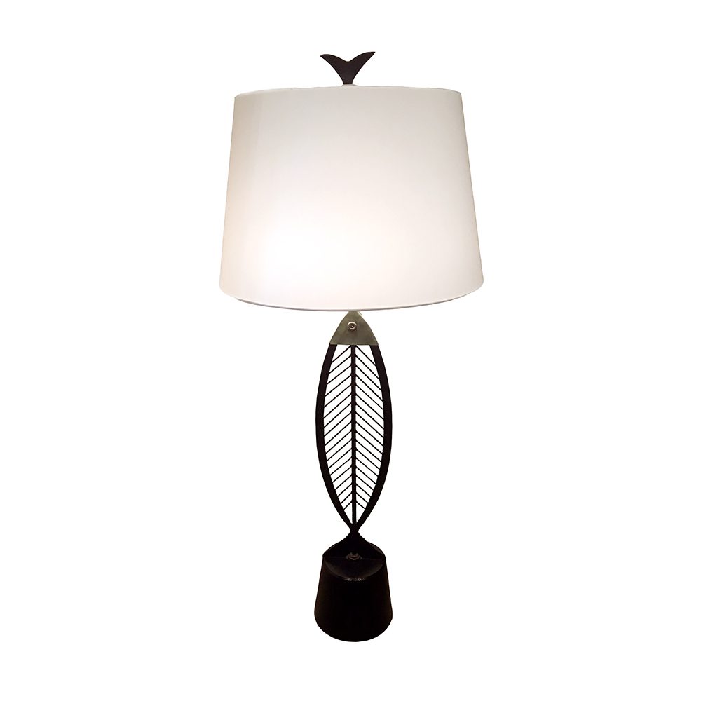 Modeled after Picasso’s fish images this tall mid century lamp is attributed to Yasha Heifetz. Steel and brass body with wood base and large tapered shade.
